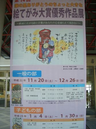 広島県の安芸郡熊野町にある筆の里工房でちょっとおおきなありがとうの絵手紙展をしています。県内はもとより全国中や海外作品もありました。