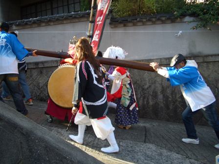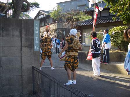 ピーヒャラ・ピーヒャラと賑やかな音がしたら、大人も子供も家から飛び出していきます。寄付金集めに各家や商店・会社を廻ります。